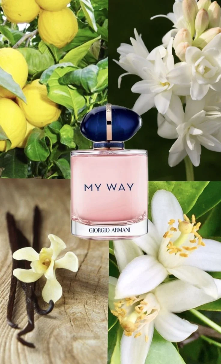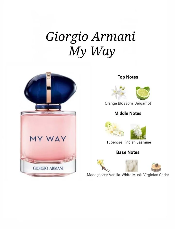 My Way by Giorgio Armani is a Floral fragrance for women. My Way was launched in 2020. My Way was created by Carlos Benaïm and Bruno Jovanovic. Top notes are Orange Blossom and Bergamot; middle notes are Tuberose and Indian Jasmine; base notes are Madagascar Vanilla, White Musk, and Virginia Cedar.