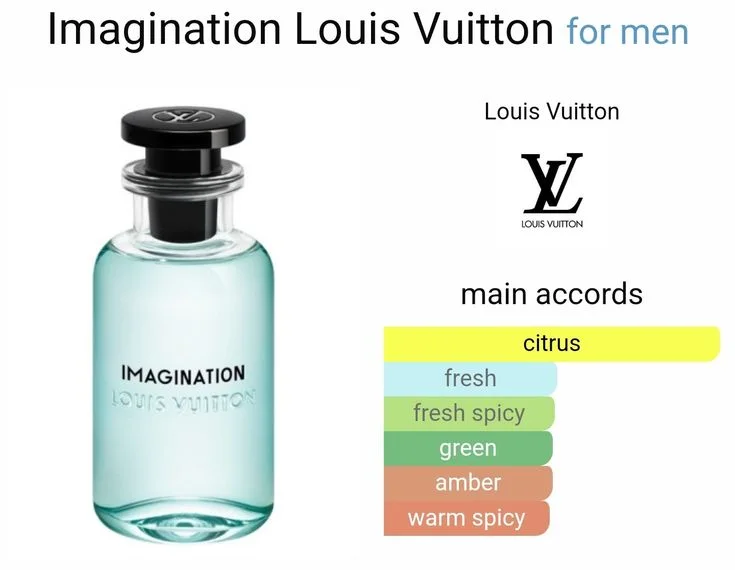 Imagination by Louis Vuitton is a Citrus Aromatic fragrance for men. Imagination was launched in 2021. The nose behind this fragrance is Jacques Cavallier Belletrud. Top notes are citron, Calabrian bergamot, and Sicilian orange; middle notes are Tunisian neroli, Nigerian ginger, and Ceylon cinnamon; base notes are Chinese black tea, ambroxan, guaiac wood, and frankincense resin.