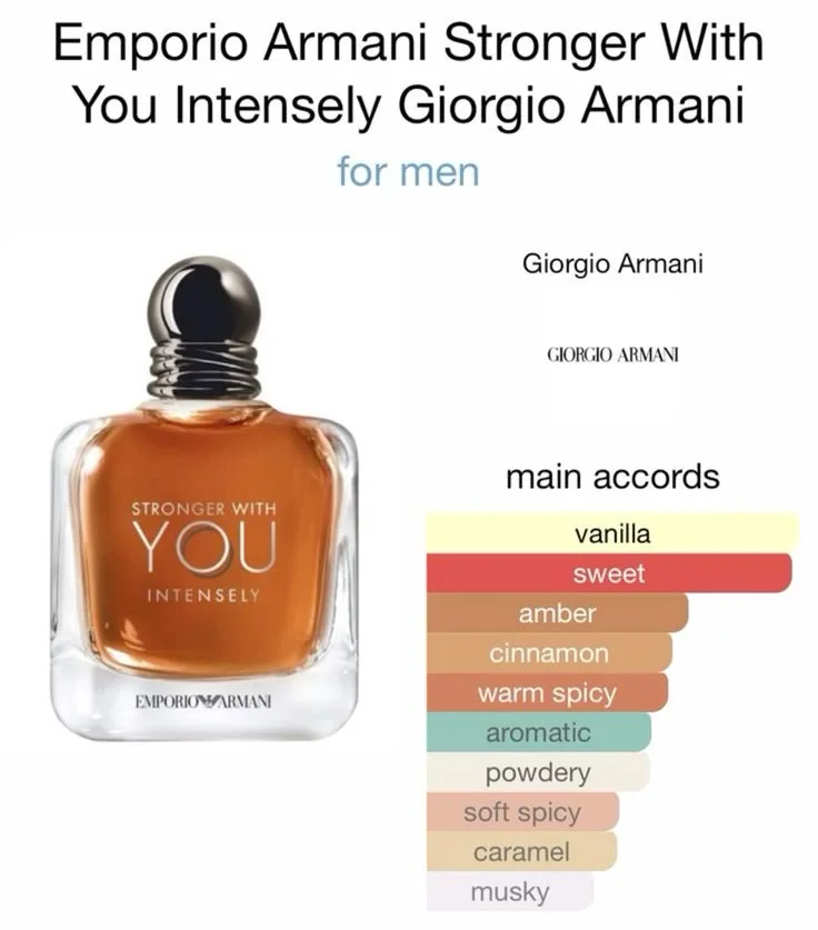Emporio Armani Stronger With You Intensely by Giorgio Armani is an Oriental Fougere fragrance for men. Emporio Armani Stronger With You Intensely was launched in 2019. Top notes are pink pepper, juniper, and violet; middle notes are toffee, cinnamon, lavender, and sage; base notes are vanilla, amber, tonka bean, and suede.