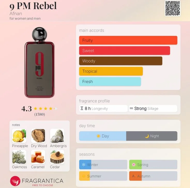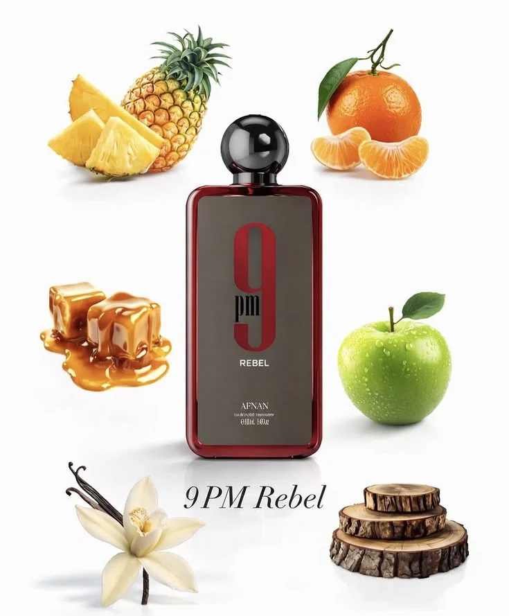 - PM Rebel by Afnan is an Aromatic Fruity fragrance for women and men. This is a new fragrance. 9 PM Rebel was launched in 2024. The nose behind this fragrance is Gaël Montero. Top notes are pineapple, Granny Smith apple, and mandarin orange; middle notes are oakmoss, cedar, and vanilla; base notes are dry wood, ambergris, caramel, and musk.